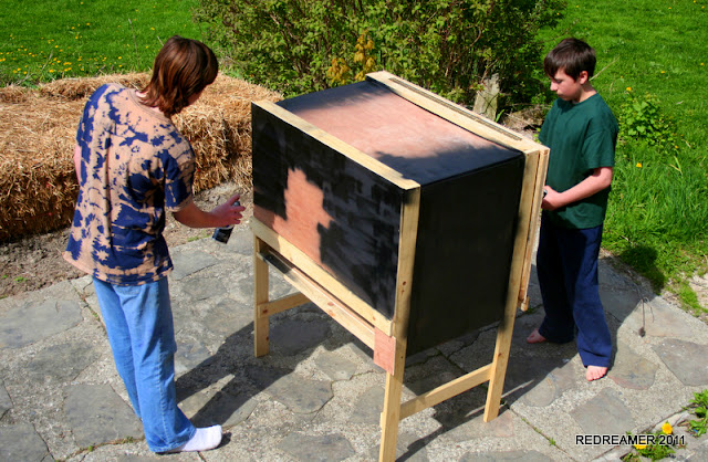So last job we did was make the box waterproof.... and while we only got a very thin layer of paint on since we ran out... it will help protect the wood until we get some more today. We also considered that painting it black would add to it's thermal quality and make it slightly hotter inside...